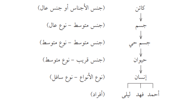 والنوع والجنس لفظان نســبيان، حيث لا يفهم أحدهما إلا بالنســبة للآخر، كما نلاحظ في الألفاظ الســابقة. فلفظ إنســان (نوع)، ولفظ حيوان (جنس)، وكذلك لفظ شجرة (نوع) ولفظ نبات (جنس) … وهكذا. وتوضح شجرة (فورفوريوس) مراتب الأجناس والأنواع، على النحو التالي: