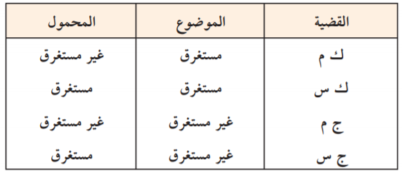 وبهذا المعنى نتناول الموضوع والمحمول في القضايا الأربع على النحو التالي: