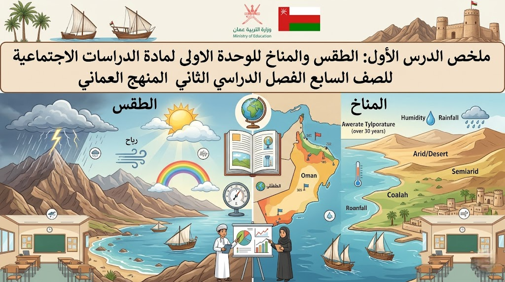 نقدم لكم ملخص الدرس الأول: الطقس والمناخ للوحدة الاولى لمادة الدراسات الاجتماعية للصف السابع الفصل الدراسي الثاني المنهج العماني