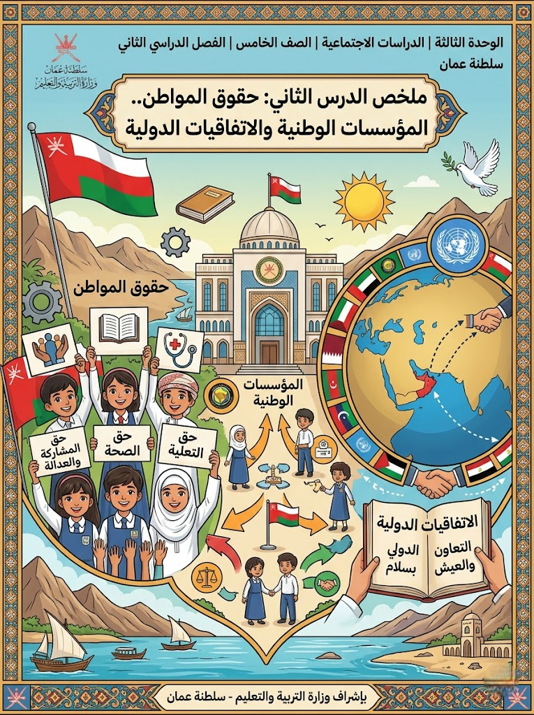 مقدمة الدرس: يُعرّف هذا الدرس بأبرز المؤسسات الوطنية التي ترعى حقوق المواطن العُماني، ويستعرض أهم الاتفاقيات الدولية المتعلقة بحقوق الإنسان والطفل والمرأة التي انضمت إليها سلطنة عُمان.
