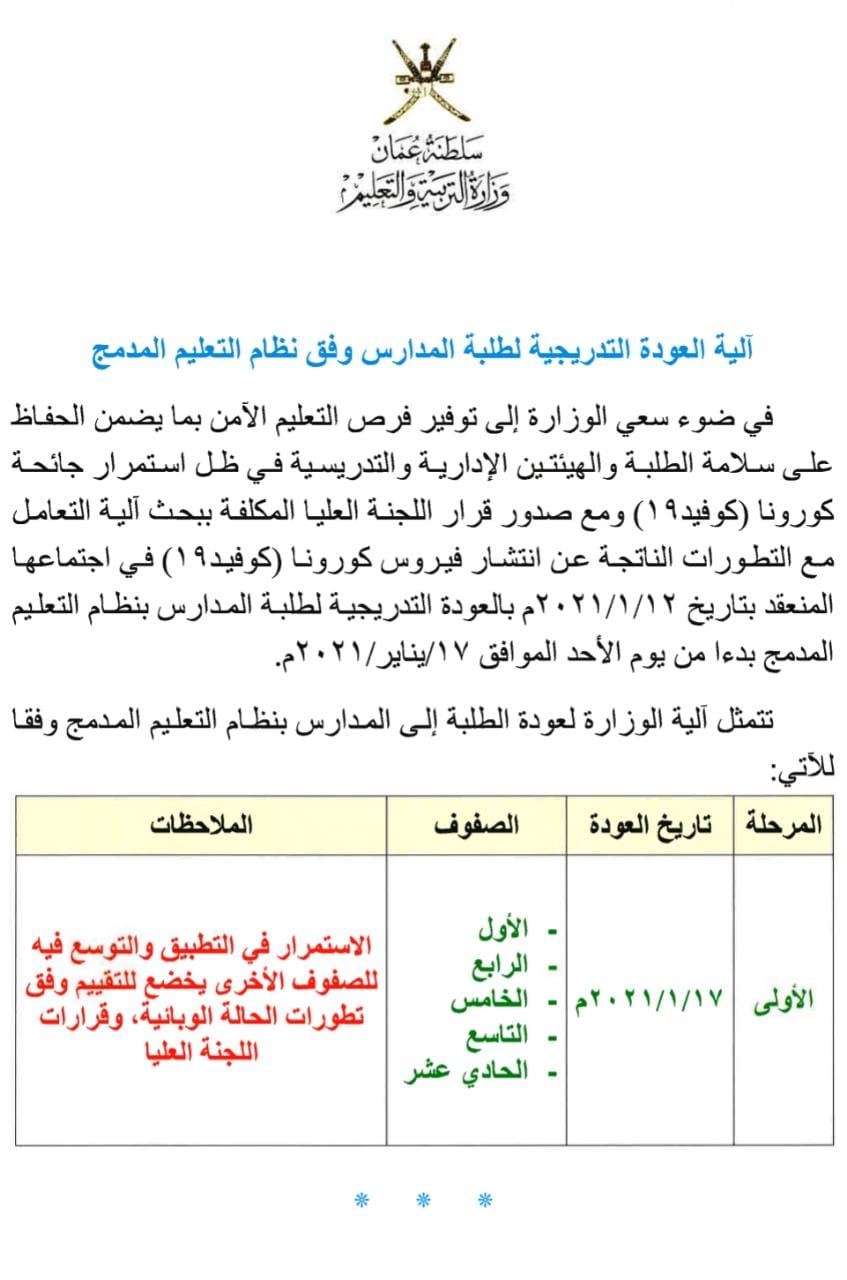 في ضوء سعي الوزارة إلى توفير فرص التعليم الأمن بما يضمن الحفاظ على سلامة الطلبة والهيئتين الإدارية والتدريسية في ظل استمرار جائحة کورونا (كوفيد ۱۹ ) ومع صدور قرار اللجنة العليا المكلفة ببحث آلية التعامل مع التطورات الناتجة عن انتشار فيروس كورونا (کوفيد۱۹) في اجتماعها المنعقد بتاریخ ۲۰۲۱/۱/۱۲م بالعودة التدريجية لطلبة المدارس بنظام التعليم المدمج بدءا من يوم الأحد الموافق 17 /يناير/ ۲۰۲۱ م.